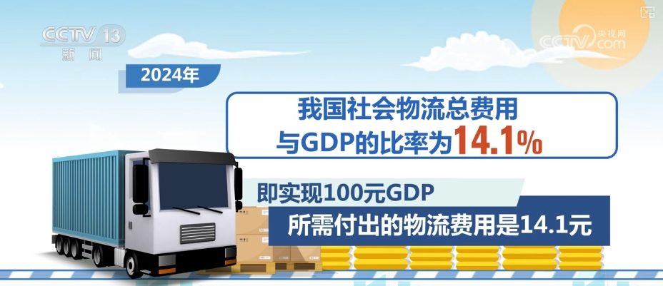 2024年,我们国家社会物流总费用与GDP的比率为14.1%,即实现100元GDP所需付出的物流费用是14.1元。与2023年相比,这一比率下降了0.3个百分点。简单理解,就是每创造100元GDP所需耗费的物流费用减少了0.3元。