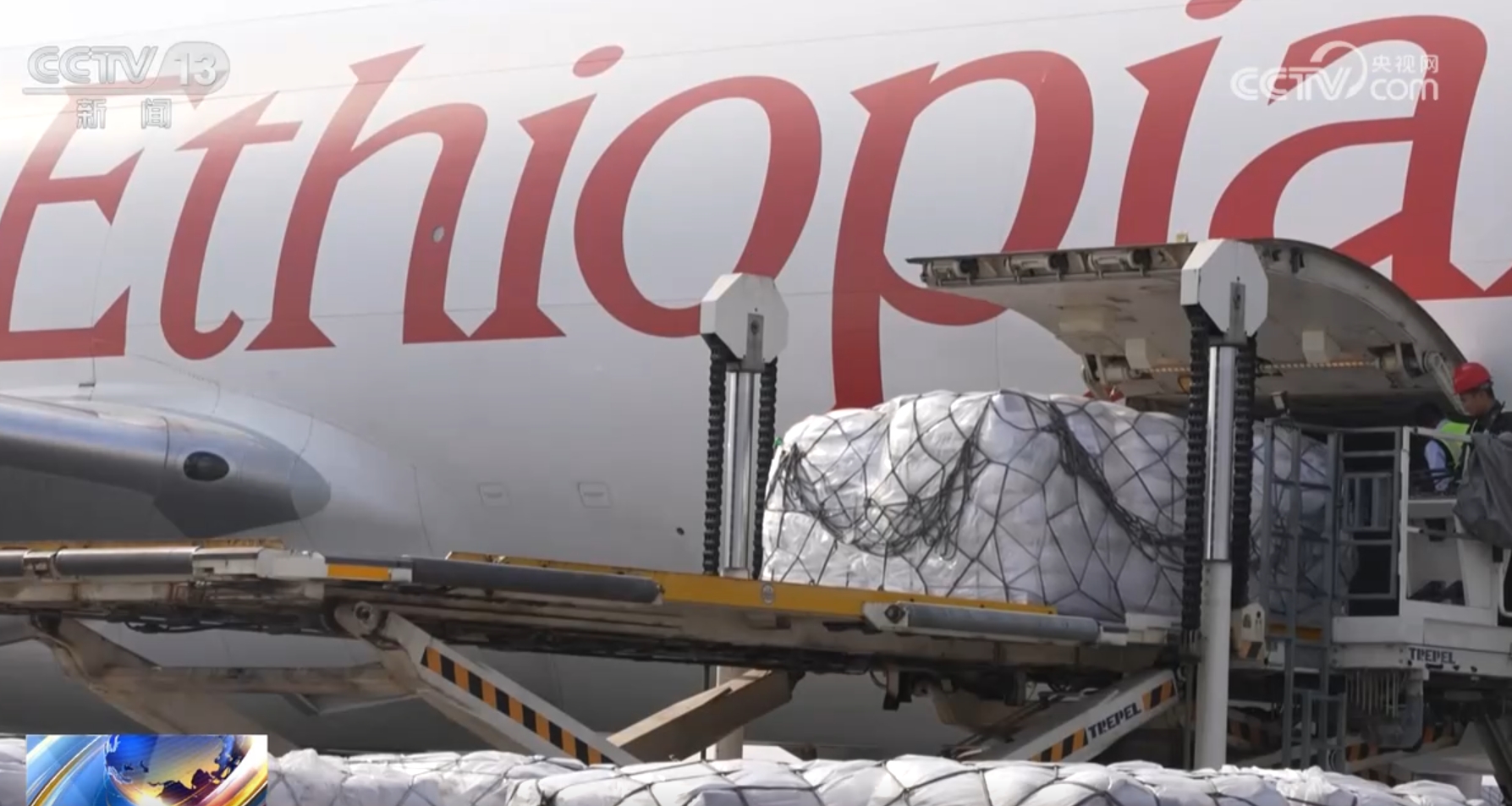 在郑州新郑世界机场北货运区,工作人员正在给新开航线“郑州保加利亚索菲亚-比利时列日”的货机装货。