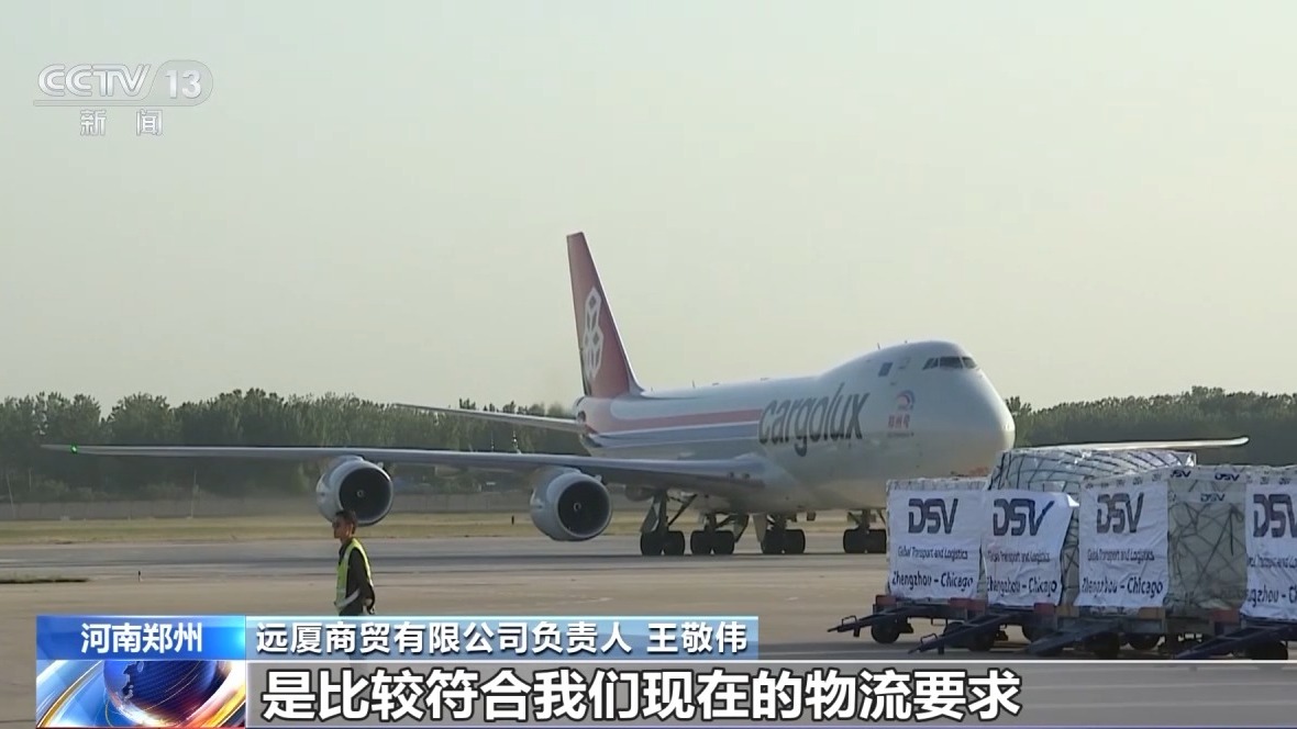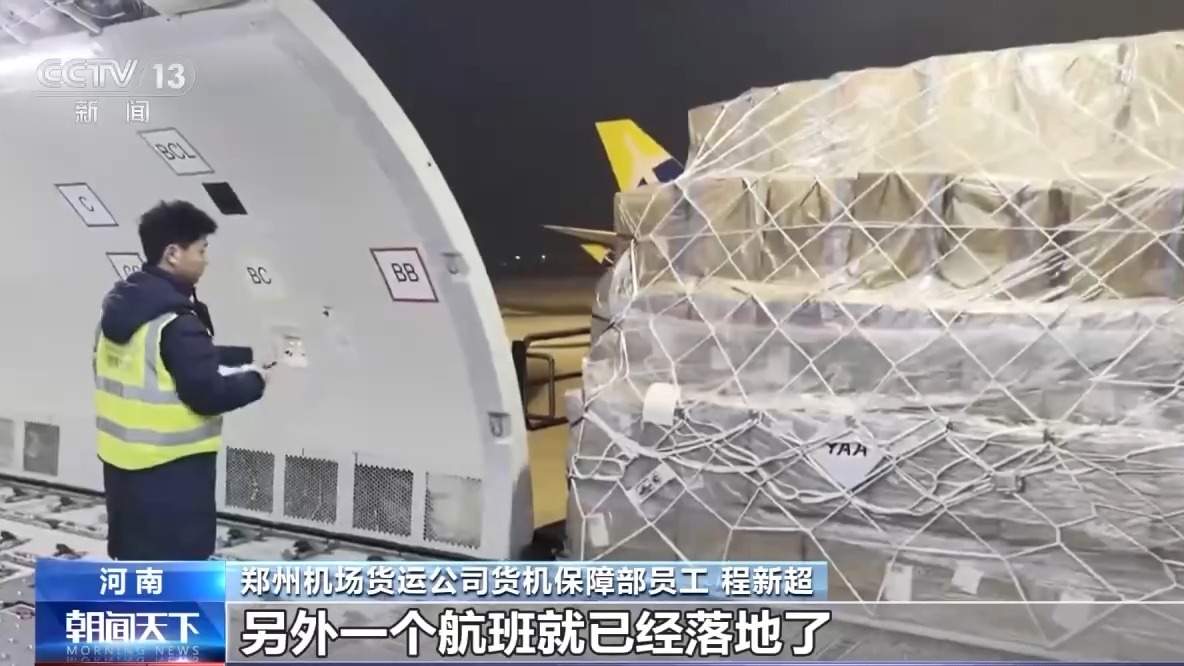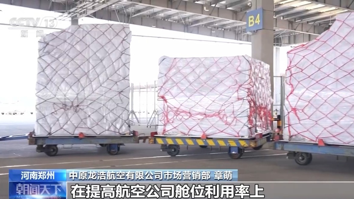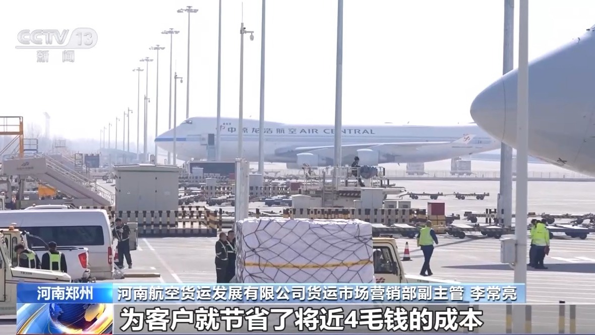 河南航空货运发展有限公司货物运输市场营销部 李常亮:时效能够提升3到6个小时,而且我们现在对中转货实行一次性收费,算下来相当于我们一公斤为客户就节省了将近4毛钱的成本。