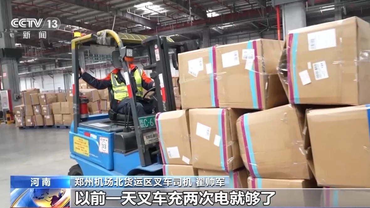 郑州机场北货运区叉车司机 翟帅军:飞机航班多不多,装得满不满,看我这边就知道,以前一天叉车充两次电就够了,现在要充四次电。