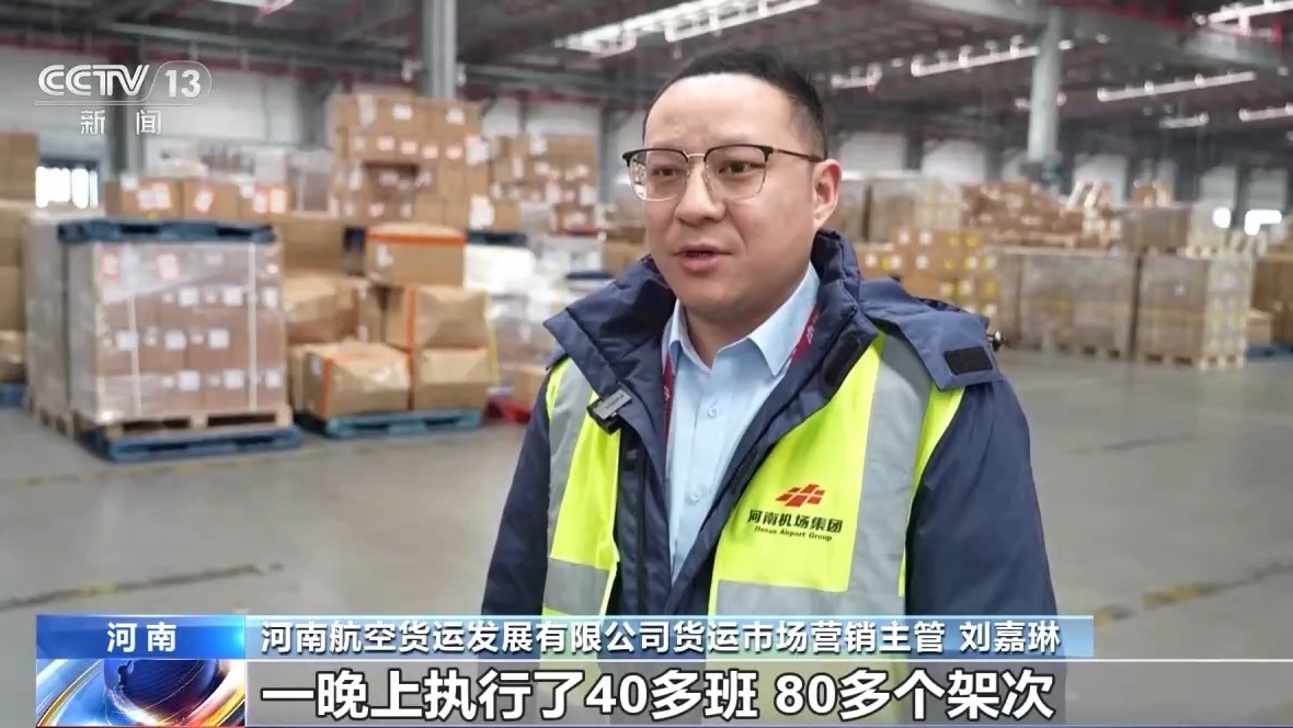 河南航空货运发展有限公司货物运输市场营销主管 刘嘉琳:最繁忙的时候,一晚上执行了40多班,80多个架次。每一个环节、每个时间节点我们都有监控,哪个节点出现一些明显的异常问题了,耽搁的时间相对来说比较长了,后台对现场进行提醒。高峰期加派人员,大幅度的提升了作业效率。