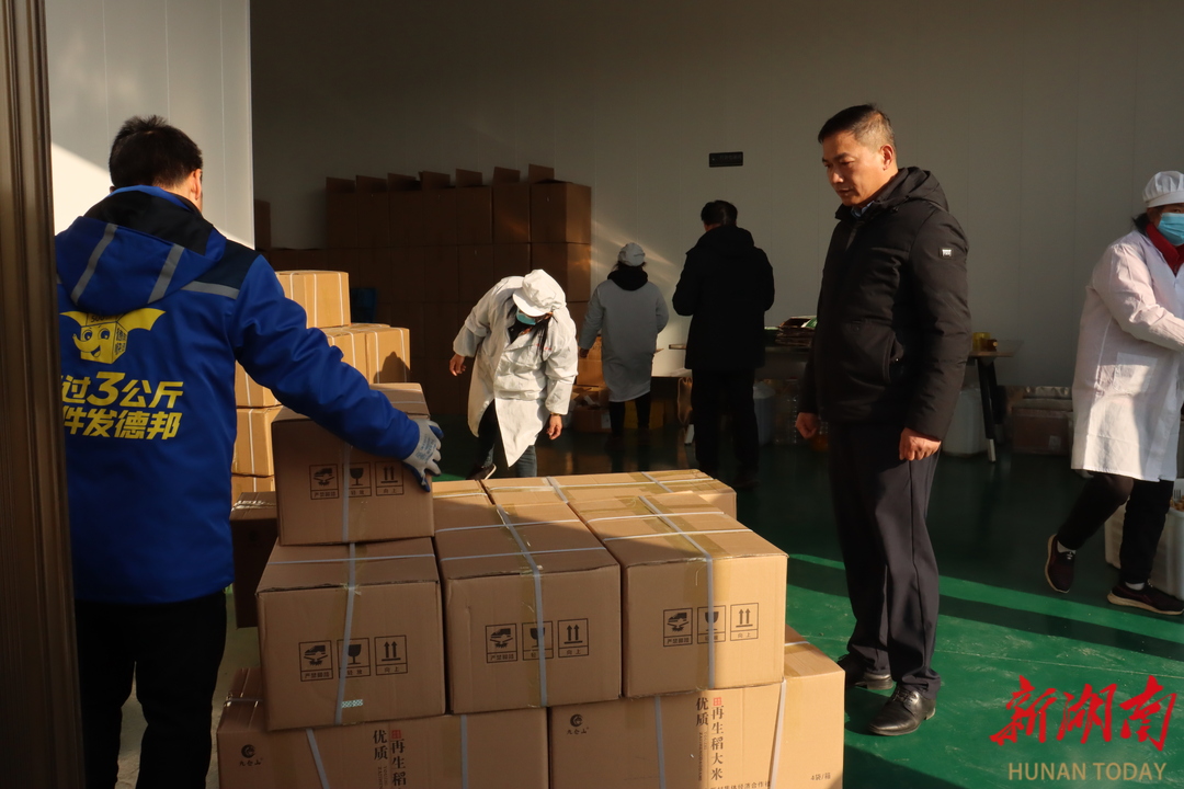 汨罗镇九雁村的锦程生态农业开展有限公司仓储加工物流中心内,工人正聚精会神地进行着优质稻米、黑豆、茶油的打包作业,如火如荼赶制新年订单